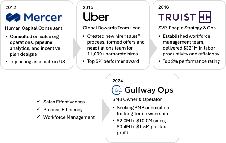 After beginning my career as a salesman in family businesses, I studied Finance in business school before joining a top workforce consulting firm, helping leaders design best-in-class sales teams and incentive plans. I took those experiences to the startup tech world, creating a new hire sales process to rapidly scale the business at responsible costs. Most recently, I started a workforce management team within a large bank, improving HR operations and partnering with business leaders on hiring, engagement, and retention strategies.